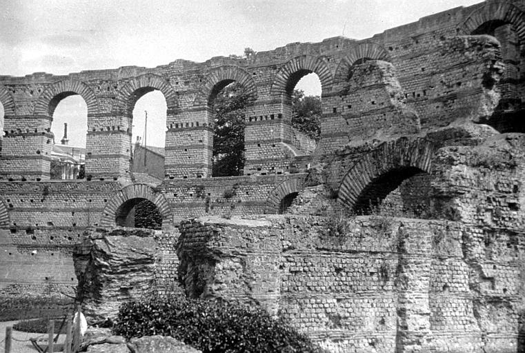 Amphithéâtre édifié entre les années 254 et 268, dont les vestiges ont été englobés au milieu de constructions (arcades, murs...) lors de son lotissement à la fin du 18e siècle. La partie la mieux conservée a été aménagée en square. L'appellation actuelle, qui apparaît en 1367, se rattache soit à l'empereur Gallien, soit à la fille du roi de Tolède, Galiene, épouse légendaire de Charlemagne. Au début du 17e siècle, les deux entrées axiales subsistaient entièrement, ainsi qu'un quart de la cavea. Le reste avait été démoli pour ne pas servir de retranchement à l'ennemi en cas de guerre. En 1793, l'adjudication des ruines provoqua leur démolition, interrompue en 1794. La superstructure est entièrement en blocage parementé en moellons. Cordons de briques. Gradins et planchers devaient sans doute être en bois d'après la présence de nombreux trous de poutres. Une soixantaine d'arcades ouvertes dans le mur extérieur donnaient accès à des galeries et vingt de ces accès se prolongeaient jusqu'à l'arène. Les portes se composaient, en rez-de-chaussée, d'un grand couloir flanqué de deux autres plus étroits, aboutissant à l'arène et sans communication avec les galeries. Les murs latéraux du couloir central se creusaient en contreforts concaves. Les portes étaient surmontées d'une fenêtre encadrée par deux niches. Le tout était couronné par une corniche à modillons. Des pilastres, toscans au rez-de-chaussée, doriques au premier étage, ornaient le tour de l'édifice.