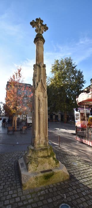Le fût de la croix seul est ancien. La croix proprement dite a été refaite au début du 20e siècle, reproduction fidèle de l'ancienne ou inspirée d'une croix de l'époque. La croix est désignée dans un document de 1518. Une plinthe carrée surmontée d'un socle de même forme passant à l'octogone, sert de base au fût. Ce fût est entouré de quatre pilastres, espèces de contreforts surmontés de clochetons et réunis au milieu par des arcs à contre courbes, dont l'extrados est couvert de choux frisés et l'intrados polylobé. Ces arcs servent de dais à quatre statuettes. Les pieds de ces figures reposent sur des pilastres hexagones à demi engagés, s'élevant entre les contreforts et couverts d'ornements flamboyants. Au-dessus des dais, le fût octogone s'élève en se rétrécissant jusqu'à la corniche.