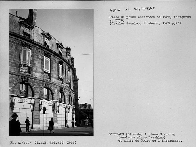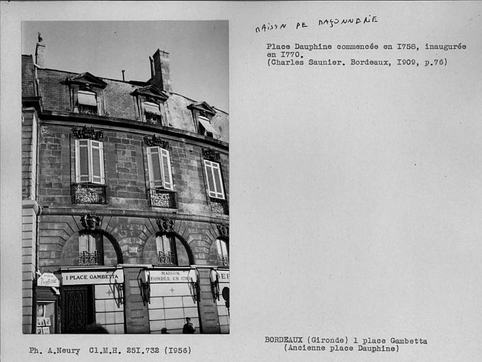 Après la place de la Bourse, celle de Gambetta (ancienne place Dauphine) est l'ensemble architectural urbain le plus important de Bordeaux. Les principales voies y aboutissent. Elle est entourée d'immeubles de la seconde moitié du 18e siècle, bâtis suivant une ordonnance classique. Vers 1745, l'intendant de Tourny, poursuivant son oeuvre d'assainissement et d'embellissement de la ville, ordonna la formation d'une place sur des terrains situés à l'ouest des portes Dauphine et Dijeaux. En 1750, les Jurats contractèrent un emprunt pour fonder et élever les façades des maisons uniformes de la place, composées d'un rez-de-chaussée à arcades portant un étage, un attique et un comble. En 1762, l'architecte fit accepter par l'intendant Boutin un nouveau plan de décor des façades, plus simple que le premier. Il consistait à supprimer les avant-corps prévus et les balustrades, et à surmonter les maisons d'un simple entablement et d'un comble. La place ne fut achevée qu'entre 1770 et 1780, mais le style reste celui de la première moitié du 18e siècle. A chacun des angles de la place rectangulaire s'ouvrent deux artères importantes. L'ordonnance des immeubles comporte une façade de pierre de taille. Au rez-de-chaussée, une arcade régulière avec piédroits à bossages encadrant la porte. Un entresol à petites fenêtres est ménagé dans l'arrondi de l'arcade. Au premier étage se trouvent de grandes portes-fenêtres couronnées de mascarons sculptés et munies de balcons à fer forgé. Quelques immeubles comportent un second étage.