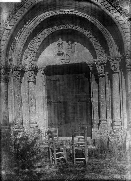 Eglise romane du 12e siècle, dotée en 1685 d'un bas-côté sud. La nef principale rectangulaire est lambrissée et précède une abside un peu plus resserrée, formée d'un rectangle et d'un demi cercle. L'abside se termine par un cul de four. Deux pilastres marquent la séparation de l'abside et du choeur. La façade ouest comporte une porte romane flanquée de deux fausses portes richement décorées. La porte centrale a trois arcades cintrées en retrait, portées sur des colonnes. Les archivoltes sont décorées de dents de scie et d'entrelacs. Les chapiteaux des colonnes sont ornés de personnages à costumes striés, de figures de quadrupèdes et d'oiseaux, d'une sirène, de palmes, de pommes de pin... Sur le tympan sans linteau sont représentés la Vierge et Saint-Pierre. Au-dessous, un médaillon renferme une croix grecque. Les deux fausses portes présentent une ornementation identique.