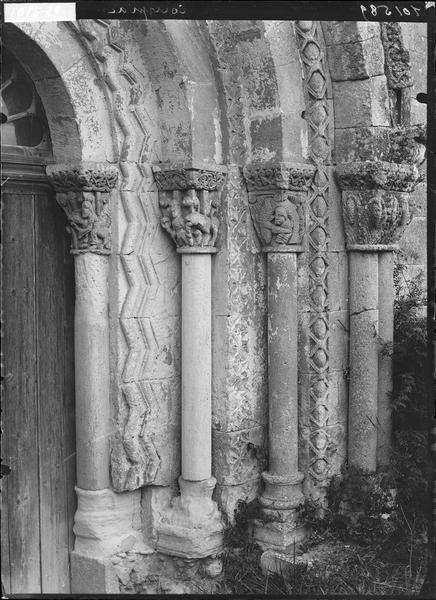 Edifice du 12e siècle. Le portail d'entrée, au sud, possède un décor de chapiteaux historiés (Samson et le lion, sirènes, centaures...). L'abside est couverte d'un cul-de-four et la travée droite d'un berceau brisé. Les deux chapiteaux de l'arc triomphal illustrent le péché originel et la multiplication des pains, et datent des années 1130-1140. Au 16e siècle, l'église est fortifiée : exhaussement du chevet, fente de tir, bretèche. La charpente date du 16e siècle. La sacristie date de 1722.