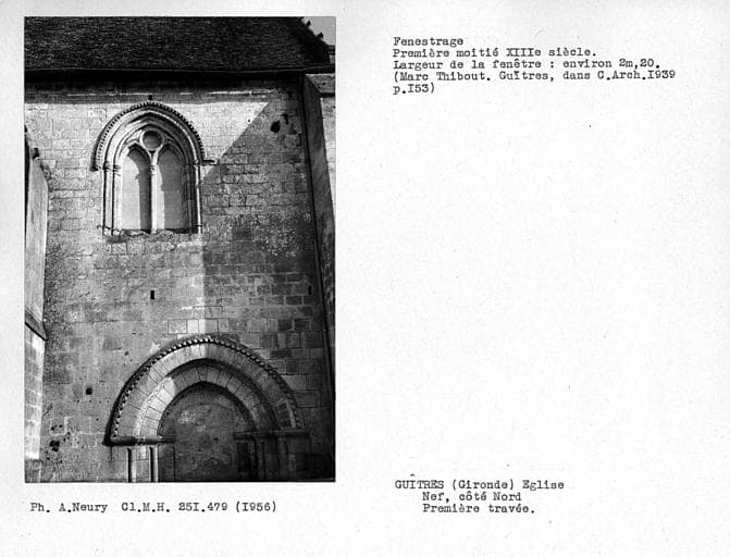 L'abbaye de Guîtres, de l'ordre de Cluny, a été fondée au plus tard pendant la dernière moitié du 11e siècle. L'église et la maison conventuelle sont encore visibles. L'église en forme de croix latine est romane, composée de trois nefs. L'abside est circulaire, voûtée en cul de four et s'ouvre par cinq ouvertures légèrement ogivales sur un déambulatoire flanqué de trois absidioles. Le transept est voûté en berceau et deux petites absides s'ouvrent sur la face orientale de ses bras. La croisée est surmontée d'une coupole sans pendentifs. La nef principale et les nefs latérales portent la trace de remaniements successifs. De la partie primitive ne subsistent que les murs latéraux des trois premières travées orientales. Les voûtes romanes ont été remplacées au 13e siècle. La façade occidentale porte également la trace de remaniements. La partie basse du 13e siècle est richement décorée d'arcatures. Elle est surmontée d'un pignon du 15e siècle. La charpente qui couvre la nef date du 15e siècle.