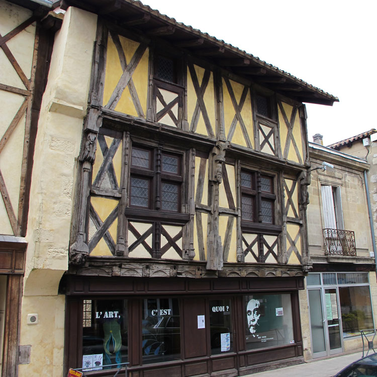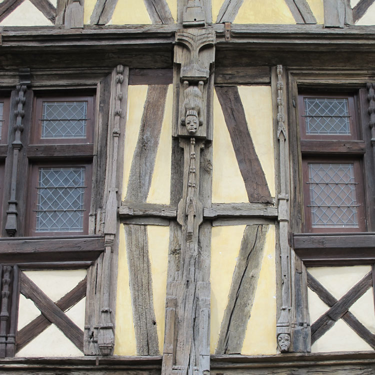 Maison du 15e siècle à deux étages sur rez-de-chaussée, chaque étage faisant saillie sur le précédent et reposant sur un bandeau de bois sculpté. Les montants des fenêtres autrefois à meneaux sont également sculptés. A l'angle de la maison et entre les fenêtres se trouvent de grosses poutres ornées de personnages. A droite, un homme nu mutilé volontairement, avec un chien à la base. Au centre, un animal à tête humaine, la base de la poutre formant niche. A gauche, une femme en robe à plis est agenouillée. Un ange sur le cul de lampe.