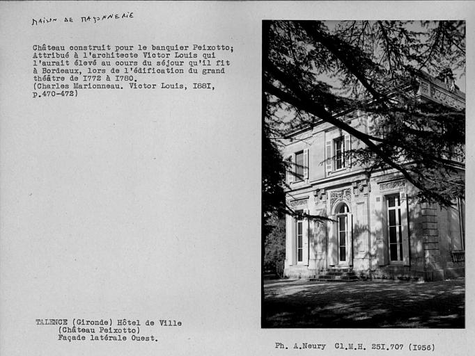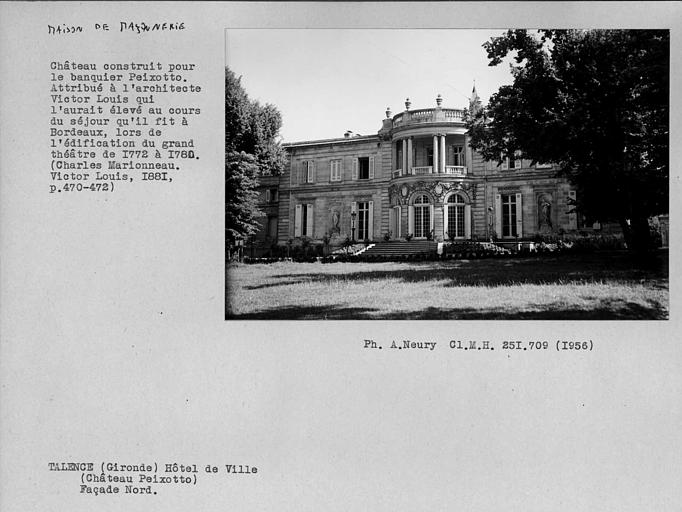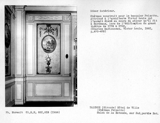 Château du 18e siècle, ayant appartenu au banquier Peixotto. Il ne subsiste de la décoration intérieure que le salon central qui fait saillie en rotonde du côté du parc. Les boiseries, encadrements de baies, la corniche existent encore ainsi que cinq trumeaux peints sur toile avec médaillons et attributs dans le goût Louis XVI. L'escalier en pierre, avec sa rampe en fer forgé subsiste également. Tous les autres locaux ont été transformés pour les besoins de la mairie.