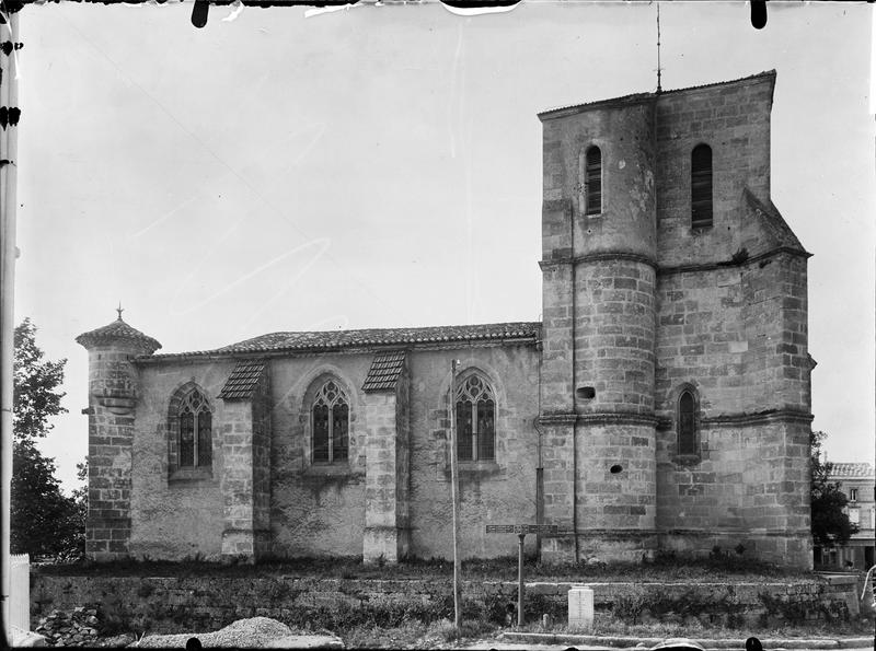 Clocher fortifié dont l'étage supérieur porte l'année 1673. Chapiteaux historiés de style 12e siècle (Adam et Eve ; Agneau accolé d'une croix ; Adoration des mages). Le portail s'ouvre à l'ouest d'une ouverture en plein cintre précédée de piédroits cantonnés de colonnes, le tout surmonté d'arcs en retrait. Chapiteaux et arcs présentent des sculptures de type roman, dont une femme tenant un crapaud qui la tète.