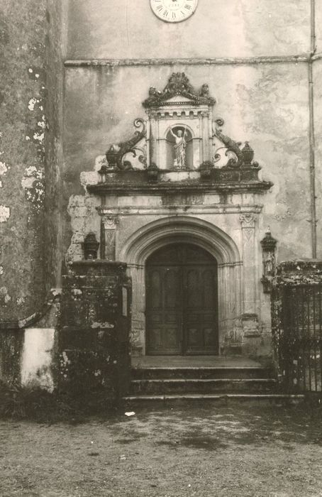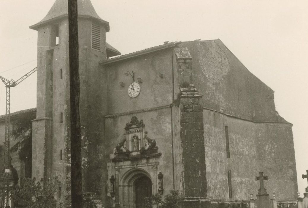 Comme nombre d'autres églises de la région, celle-ci a été fortifiée entre le 14e et le 16e siècle, et a servi de refuge au cours des guerres de Religion, lors du passage de Montgommery. Deux chapelles ont été ajoutées à la nef au 19e siècle. La nef est suivie d'un choeur polygonal, dont elle est séparée par un arc triomphal en tiers point. A l'extrémité ouest de la nef, la base de ce qui pouvait être le clocher primitif ouvre sur la nef par un arc en tiers point surbaissé, et son plafond est à poutrelles. Une tourelle d'escalier polygonale s'insère dans l'angle du contrefort nord-est du clocher. La base du clocher a été surélevée et dépasse la nef. Percé dans la face nord du clocher, le portail a été réaménagé au 17e siècle. Il présente un arc en anse de panier à deux archivoltes, encadré de pilastres à chapiteaux corinthiens supportant un entablement. Au-dessus de celui-ci se trouve une niche à statue encadrée de deux colonnettes cannelées à chaptieaux ioniques surmontée d'une frise denticulée et sommée d'un fronton triangulaire orné. De part et d'autre des pilastres se trouve une niche à statue sommée d'un dais.