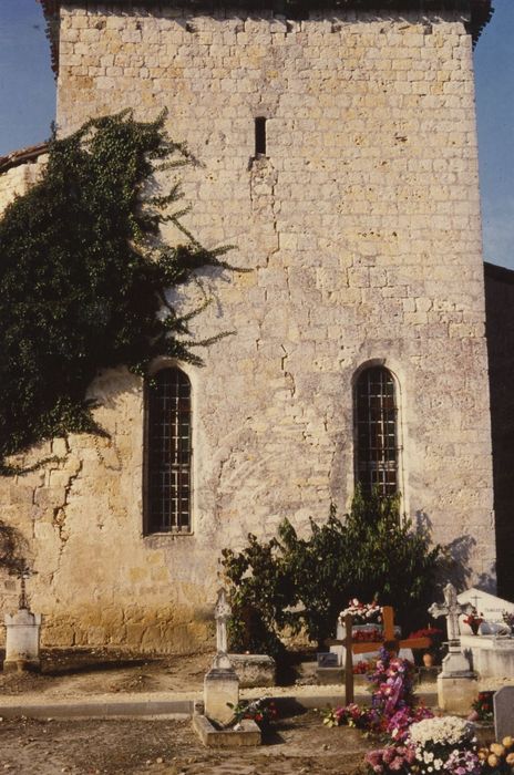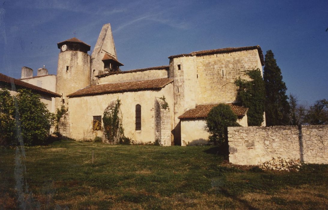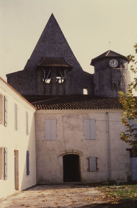 La première église remonte sans doute à la fin du 12e ou au début du 13e siècle. L'embrasure intérieure des fenêtres du choeur a sans doute été refaite au moment de la construction des bas-côtés de l'église. Sur la face orientale se distingue le tracé d'un mur pignon qui s'élève au-dessus de la voûte du choeur, reprise de construction indiquant que la chambre forte est plus tardive, sans doute du 14e siècle. De cette époque également, une tourelle à cinq pans, hors oeuvre et au droit du mur sud de l'église, contre-bute l'arc triomphal. Elle abrite un escalier à vis en pierre qui permettait d'accéder à la chambre forte depuis la nef. La façade ouest peut être assimilée, dès cette époque, à un clocher mur. Au 16e siècle, devenue trop petite, l'église est élargie par deux bas-côtés en 1522. Le pilier central est très décoré. A chacun de ses angles, une base polygonale à ressauts porte deux colonnettes interrompues par une frise aux feuillages alternés de têtes de personnages et d'animaux. De cette époque date également la tour circulaire hors-oeuvre dans l'angle sud-ouest du clocher-mur. Durant les guerres de Religion, la chambre forte a été démolie en partie haute, la voûte s'est effondrée et le clocher-mur a perdu son pignon. Dès le 17e siècle, un porche a été construit devant l'entrée de l'église, puis ce corps de bâtiment a été étendu vers le sud. Une aile en retour d'équerre a été ajoutée.