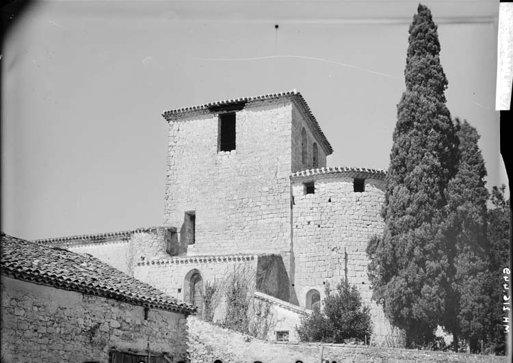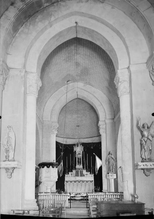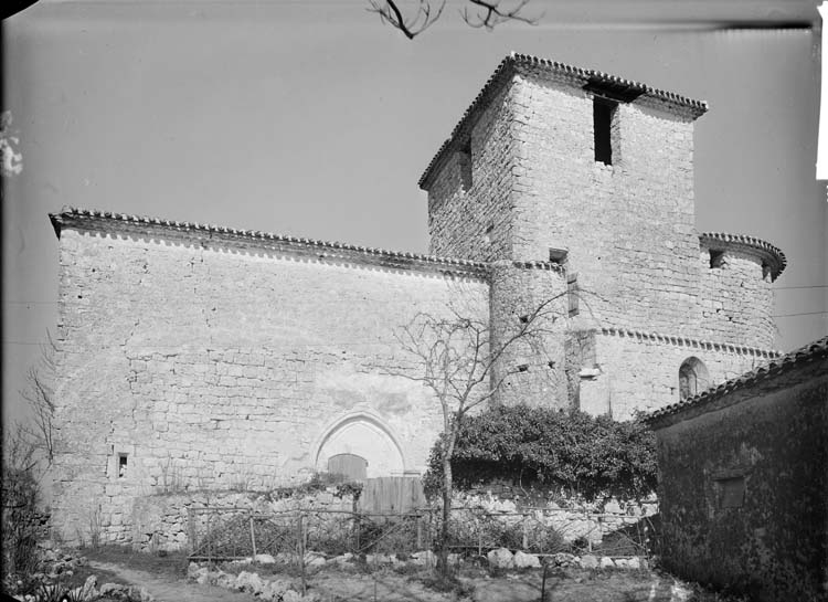 Eglise romane à une seule nef avec clocher sur la croisée du transept et chapelles postérieures sur les croisillons du transept. Voûtes en berceau refaites. Abside extrèmement élevée, formant chemin de ronde au niveau de la toiture. Clocher carré robuste et trapu, à ouvertures romanes au-dessus du choeur et carrées sur les autres faces. Tourelle ronde tronquée sur la face sud, contenant l'escalier du clocher. Porche mouluré sur cette face. L'intérieur a été restauré mais il subsiste quatre colonnes romanes à chapiteaux sculptés au transept.