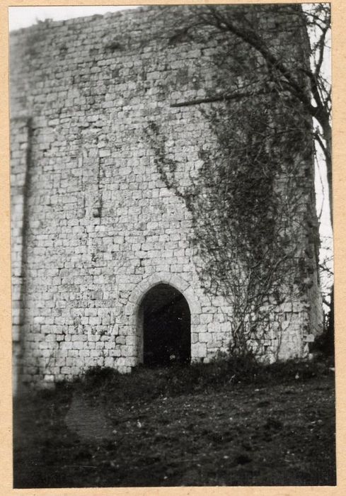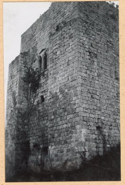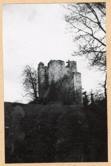 La terre est confisquée par le roi d'Angleterre à la fin du 13e siècle. Du château, seul subsiste le donjon carré. Porche en arc brisé. Emplacement d'une bretèche dont il reste les corbeaux. Fenêtre géminée sur la face est, à colonne plate, dont le sommet est trilobé. Du côté sud, une espèce de soupirail carré s'enfonce dans le sol de la tour et devait donner accès à une cave ou à un souterrain. Courtines et tours ont disparu.