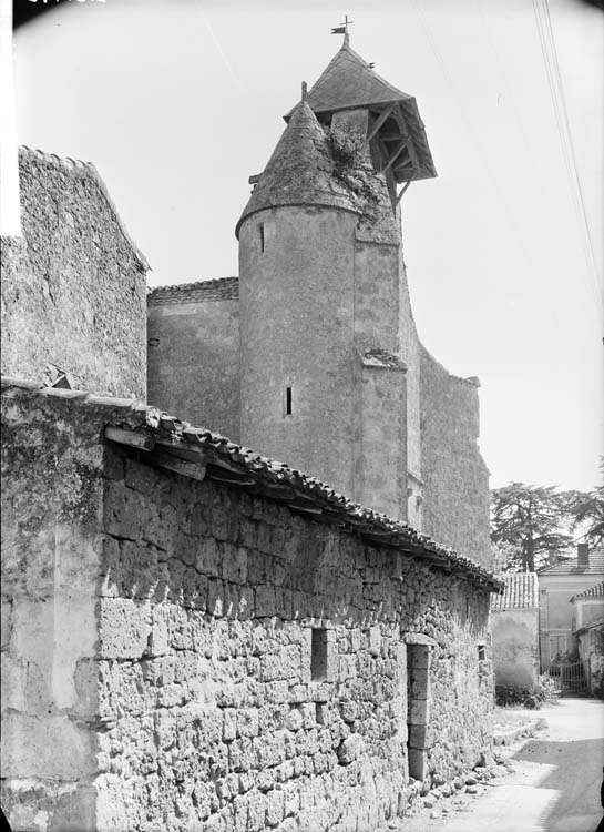 Clocher-mur désaxé, recouvert par un auvent qui protège les cloches. Un escalier placé dans une tourelle ronde permet d'accéder au clocher. Porche de la dernière période gothique, ainsi que les fenestrages. La nef se termine par un choeur à cinq pans.