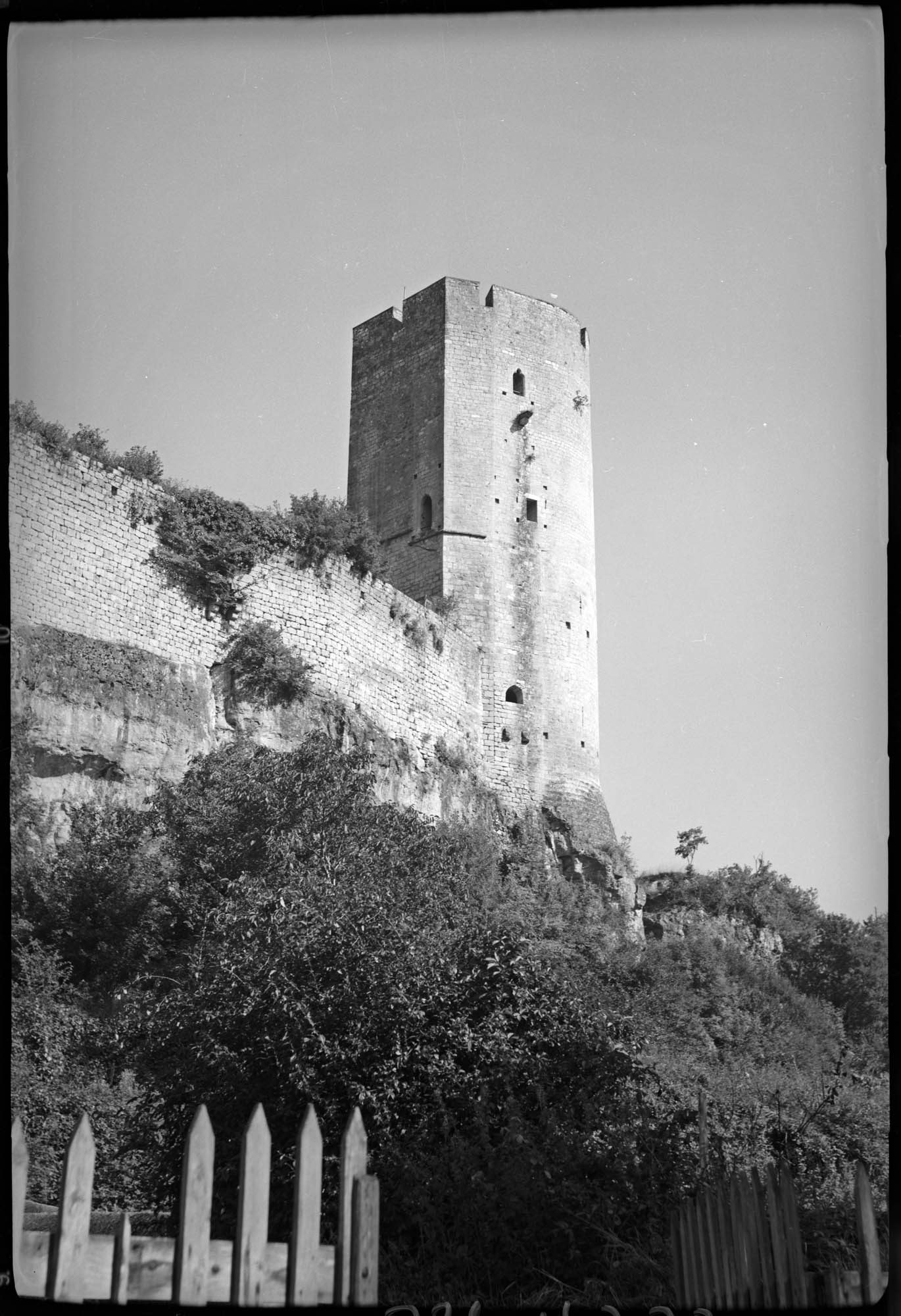 Le château est mentionné au 12e siècle. Il fut pris par l'évêque de Périgueux et entièrement rasé car devenu repaire de brigands. Il fut reconstruit assez rapidement. A partir de 1793, il tomba en ruine. Seul le donjon subsiste aujourd'hui. Les courtines subsistantes sont assez minces pour des fortifications (50 à 80 cm d'épaisseur). L'entrée du château se trouve dans une grotte située derrière l'actuelle mairie, ancienne dépendance du château bâtie au 15e siècle. Un escalier en colimaçon permet d'accéder au sol de la cour. Ce donjon avait six étages. Le premier étage, accessible par un escalier taillé dans la maçonnerie de la tour, est une sorte de galerie de défense semi-circulaire, prenant jour seulement par des archères. Le cinquième étage comportait des créneaux. Le donjon était couvert par un toit porté par une charpente. A l'extérieur, l'appareil du rez-de-chaussée et du premier étage accuse le 12e siècle. Les étages supérieurs, plus soignés, datent du 14e siècle.