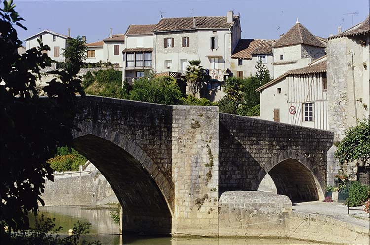 Cet ouvrage remontant à la fin du Moyen-Age comprend trois travées inégales franchies par deux arches brisées, dont la plus grande au centre, et une arche en plein cintre élargie lors de travaux effectués vers les années 1830-1838 pour rendre la Baïse navigable en amont, vers Condom. Le pont présente des avant-becs et des arrière-becs traingulaires qui remontent jusqu'au niveau du tablier, formant des refuges pour les piétons. Le pont a subi de nombreuses restaurations aux 17e et 18e siècles.