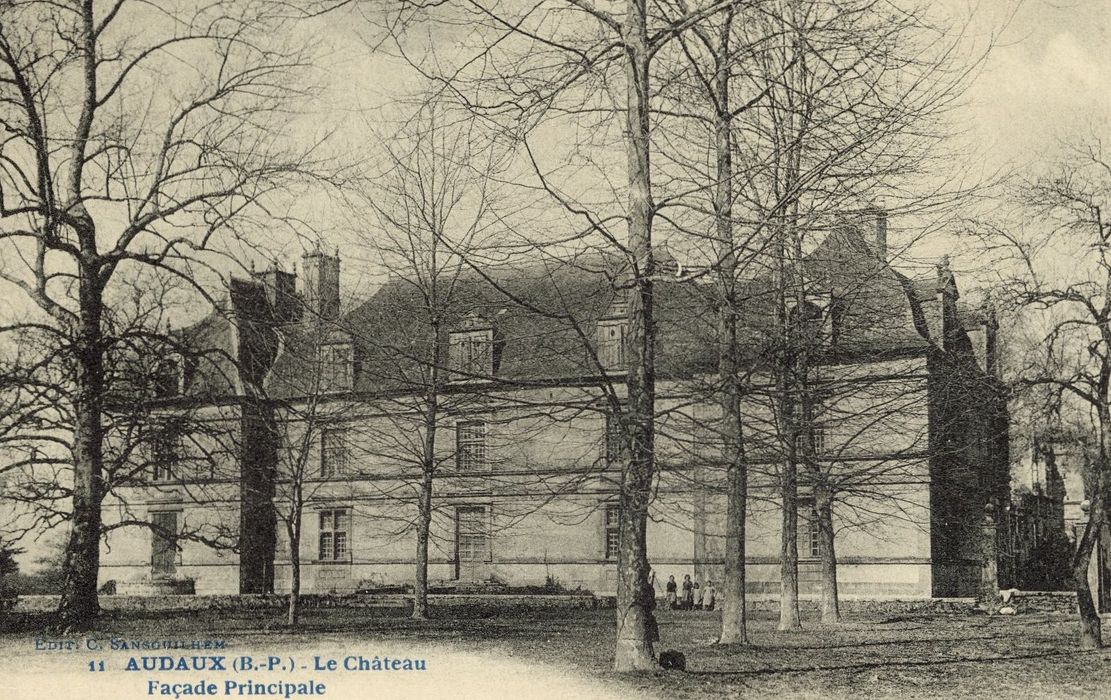 En 1650, Jean de Gassion, baron de Canon, président par provision du Parlement de Navarre, achète la terre d'Audaux. Les travaux durent commencer peu après et se terminer en 1659. En 1660, le domaine est érigé en marquisat. En 1853, Charles d'Abbadie d'Arrast aurait fait démolir l'aile des écuries et son pavillon à la suite, dit-on, de l'empoisonnement d'un de ses chiens abyssins. En 1928, le nouveau propriétaire entreprend la restauration de l'édifice. Il modifie les dispositions intérieures dans l'aile proche du gave et exécute lui-même les peintures dans les pièces du rez-de-chaussée. Le château est vendu à l'Oeuvre des Orphelins apprentis d'Auteuil en 1943. £Le vaste édifice se compose d'un corps de bâtiment principal et de deux ailes en équerre encadrant la cour d'honneur. L'aile ouest qui abritait les écuries est en ruine. A l'intérieur, un grand escalier en pierre à volées droites se développe autour de piliers réunis par des arcs. La grande salle dite "salle des Maréchaux" présente un plafond à solives apparentes décorées d'arabesques. Galerie et cheminées monumentales en pierre. Cet édifice est le plus complet et le plus intéressant témoin de l'architecture du milieu du 17e siècle en Béarn.