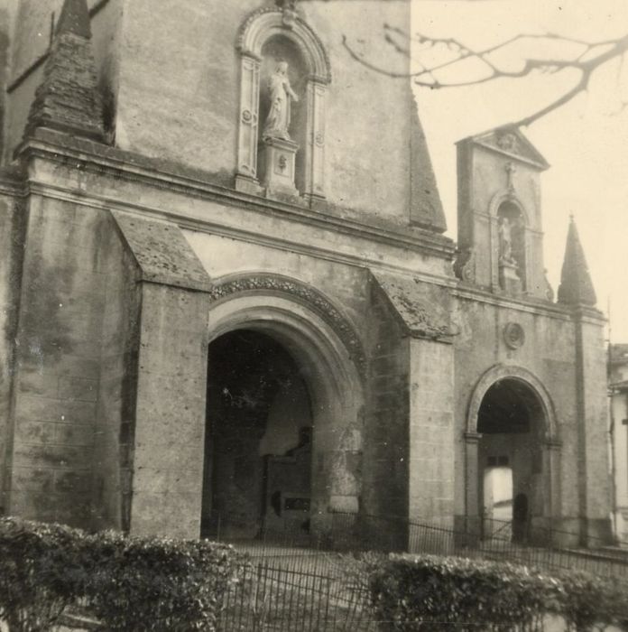 Eglise bâtie rapidement au début du 14e siècle, peu après la fondation de la bastide. Reprise (reconstruction presque intégrale) en 1776 par suite de problèmes de solidité (décor installé à ce moment et complété au 19e siècle). Il s'agit d'un édifice à nef unique, dépourvu de transept, et à chevet plat. Il est entouré au droit de ce chevet et sur ses deux côtés longs, de galeries extérieures couvertes en appentis. Sur la quatrième face s'étend hors-oeuvre un porche à trois travées dont celle du centre correspondant au clocher carré est voûtée d'une croisée d'ogives et abrite un portail sculpté. Cette travée de porche peut être attribuée au 16e siècle. Les archivoltes du portail sont décorés de sculptures. La petite porte latérale sous galerie est sommée de l'année 1715, date sans doute également attribuable aux galeries.