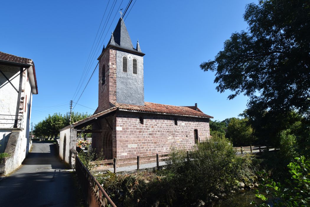 L'église, qui apparaît en 1328, est la chapelle d'un prieuré relevant de Lahonce, fondé par les Prémontés venus de l'abbaye de la Case-Dieu. Cet ensemble, lié au chemin de pèlerinage, comportait un hôpital. Le clocher, clocher-mur à l'origine, fut transformé en clocher-tour précédé d'un porche au 19e siècle.