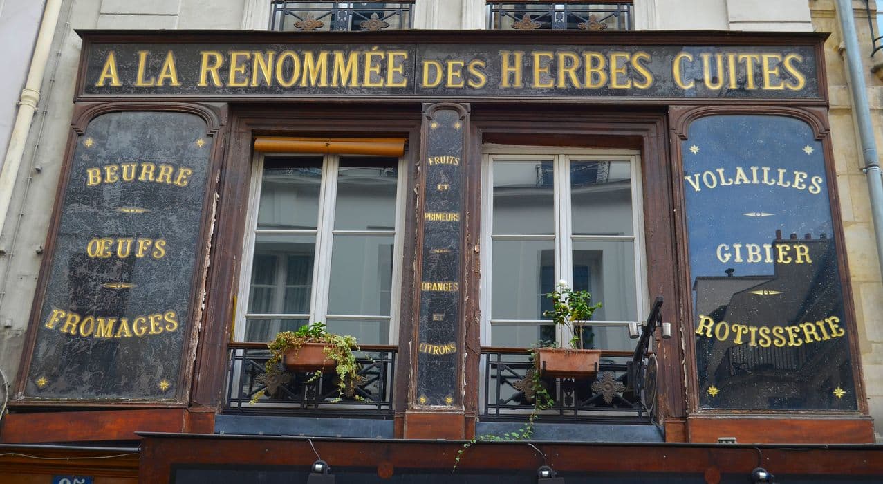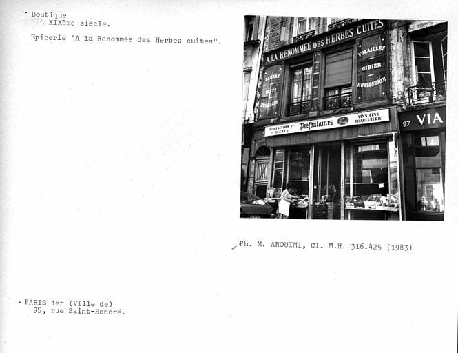 L'immeuble date du début du 19e siècle. Quatre textes dorés fixés sous verres ont été conservés au premier étage de l'immeuble. Il s'agit d'un traiteur épicier à l'enseigne de La Renommée des Herbes Cuites qui a remplacé au début du siècle La Renommée des Epinards. L'intérêt réside dans la situation de ces fixés au premier étage et l'intitulé anecdotique de l'enseigne.
