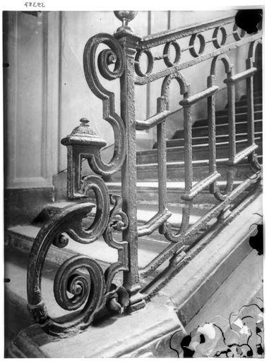 Façades sur rues et sur cours, sauf les façades 19s de la parcelle 116 ; escalier d'honneur avec sa cage et sa rampe en fer forgé (cad. 01 : 02 AO 114, 116, 120) : inscription par arrêté du 20 décembre 1984