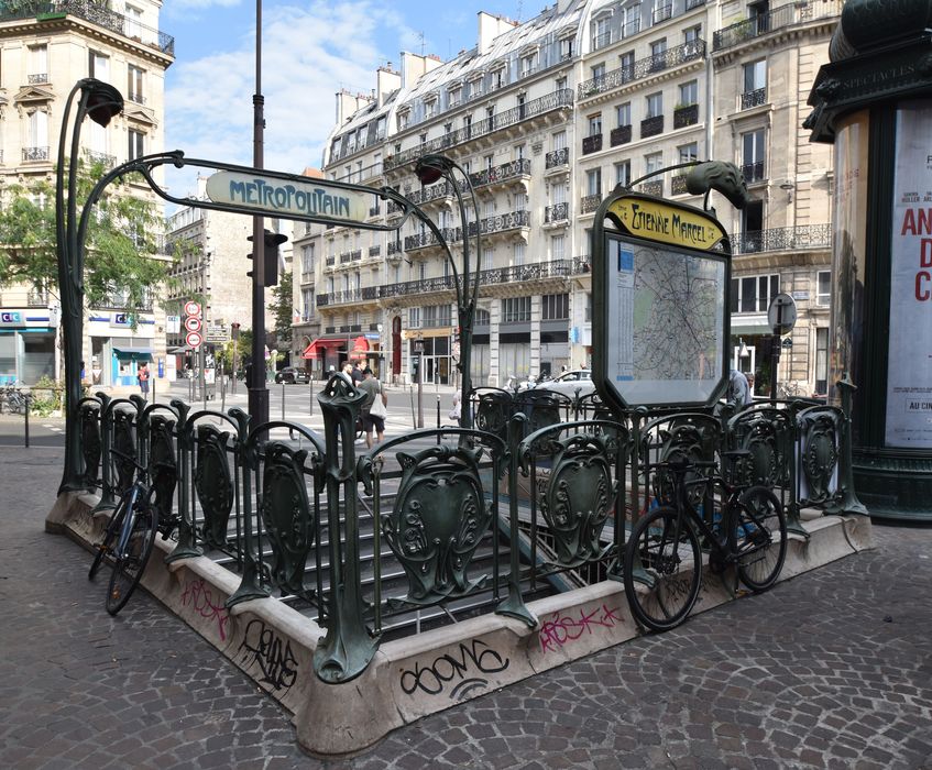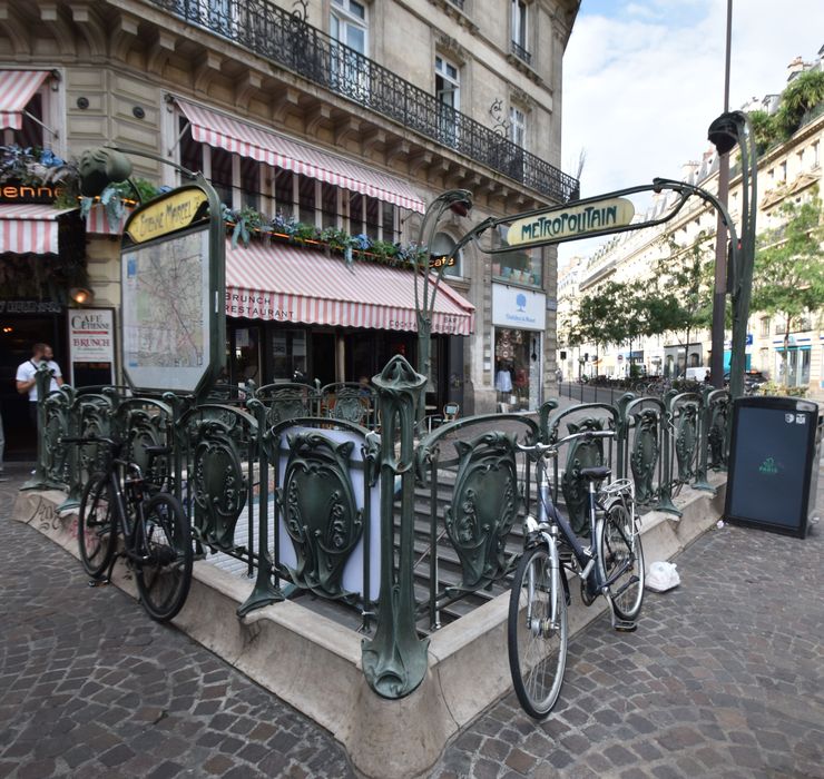 Accès à la station du métro, dessiné en 1900 par l'architecte Hector Guimard pour la Compagnie générale du Métropolitain de Paris. La station est située sur une section de la ligne 4 inaugurée en 1908. L'arrêté de protection porte sur l'ensemble des réalisations subsistantes de Guimard pour le métro.