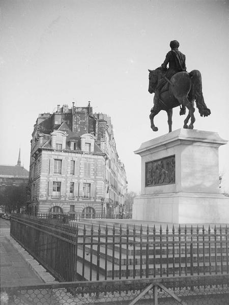 C'est à Marie de Médicis qu'est en général attribué le mérite d'avoir voulu, vers 1604, élever la statue de son époux ; celle-ci fut exécutée par Jean de Bologne et Pietro Tacca. L'inauguration officielle eut lieu le 23 août 1614, en grande pompe ; on y voit Henri IV sur son cheval de bronze, le chef découvert, le visage d'une ressemblance frappante au dire de ses contemporains, la main droite s'appuyant sur le bâton de commandement, et la gauche tenant les rênes. La statue fut abattue à la Révolution, comme toutes les statues royales. Dès la chute de Napoléon, les cercles légitimistes émirent l'idée de rétablir sur le Pont-Neuf une effigie de Henri IV, au même endroit. Roguier fut chargé de la réaliser. Mais la statue fut finalement déplacée en 1818 puis détruite en 1827. L'exécution de la nouvelle effigie fut confiée au sculpteur Frédéric Lemot. C'est la 25 août 1818 qu'elle fut inaugurée, jour de la Saint-Louis.