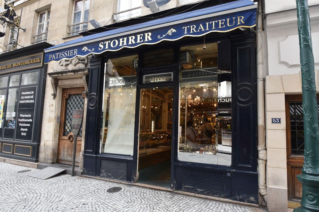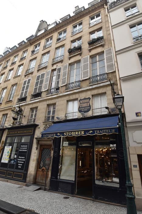 Immeuble de rapport datant de la fin du 18e siècle et possédant un très beau dessus de porte piétonne décoré d'attributs architecturaux. La pâtisserie Stohrer est fondée en 1730. La devanture est en panneautage de bois. L'intérieur est décoré de toiles fixées sous verre à motif de pinceaux et de fruits pour la frise ; elles sont dues au décorateur Thivot du Mur.