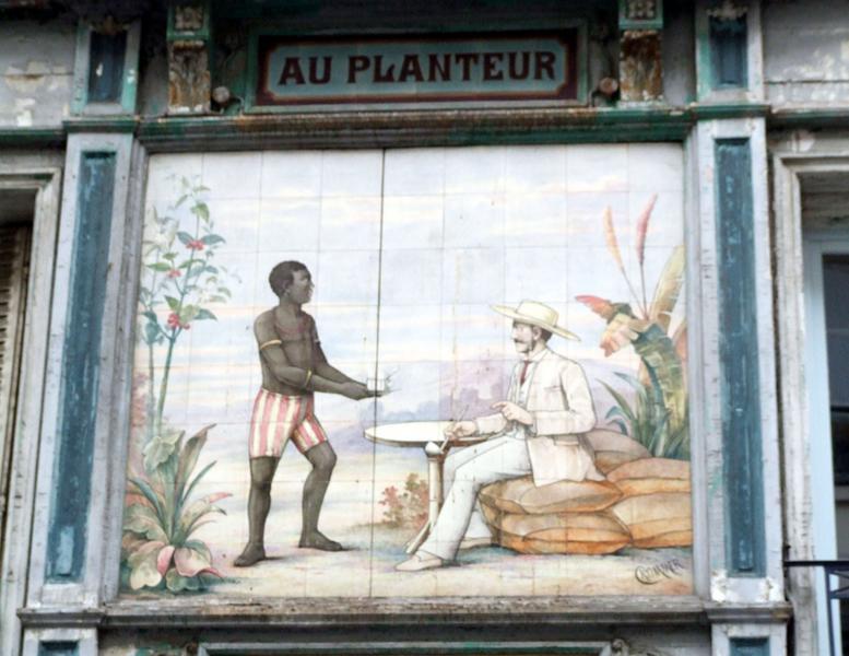 Cet immeuble date du 19e siècle. Le décor de la façade se développe sur deux niveaux. Il s'agit de coffrages de bois d'inspiration du 18e siècle. Au rez-de-chaussée, un seul commerce a conservé ses boiseries ; au premier étage, au centre de la façade, un panneau de céramique signé Crommer à l'enseigne Au planteur définit le commerce de produits exotiques. Le deuxième commerce dénature l'ensemble.