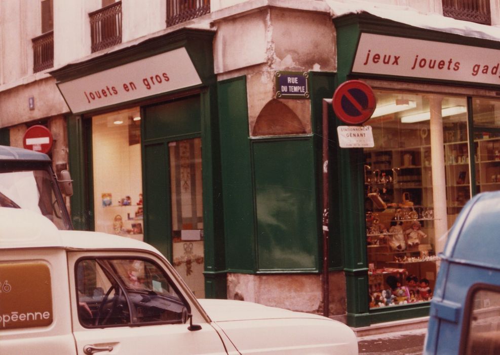 L'immeuble est d'un style courant mais de bonne qualité. La boutique occupe l'angle de la rue du Temple et de la rue de Montmorency ; l'ancien café a été décoré entre 1905 et 1920 ; les panneaux de céramique ont sans doute été inspirés par des papiers peints. Des suites des monuments de Paris avaient été éditées par la maison Defosses et Kartheu en1857. De plus, dans le catalogue de la maison Gilliot se trouve un modèle de panneau intitulé Ville ancienne proche de l'Hôtel de Guise. On retrouve du reste le thème de la maison à tourelle dans les dessins des faïenceries de Sarreguemines. Cet ancien bistrot transformé en magasin de jouets en gros a conservé en partie son coffrage de bois très simple à l'extérieur ; malheureusement, la composition des vitres a disparu et le coffrage est d'un vert violent. Les inscriptions extérieures ont disparu. Néanmoins, à l'intérieur, le très bel ensemble de carreaux de faïence subsiste ; il est caché par l'aménagement actuel du magasin. Cet ensemble se compose de quatre panneaux (ni datés, ni signés) représentant des vues de Paris au 17e siècle : la tour du Temple, le quai des Orfèvres, l'ancien hôtel de Guise et l'hôtel Barbette. Nous y voyons des boutiques, des échoppes, des rues pavées, une carriole circule, et des personnages animent ces scènes de la vie d'autrefois. Le reste du décor est composé de carreaux fleuris ; une frise entoure la salle de ses corolles jaunes et vertes très stylisées. La cimaise est une bande de rectangles verts et marrons à reliefs de palmettes coloriées de jaune. Le soubassement est réalisé avec des carreaux blancs où se déroule une frise florale. Cet ensemble n'est ni signé, ni daté.