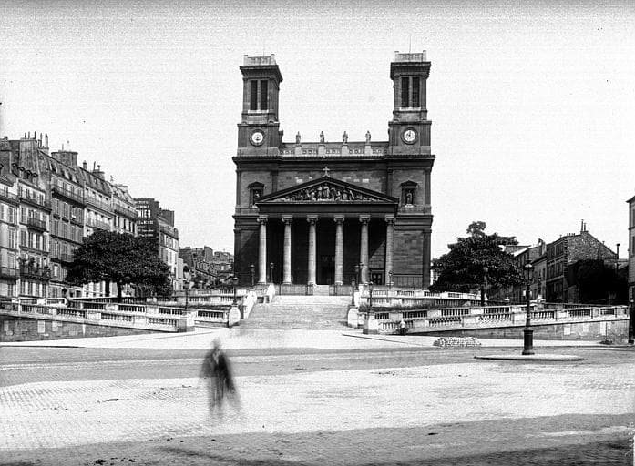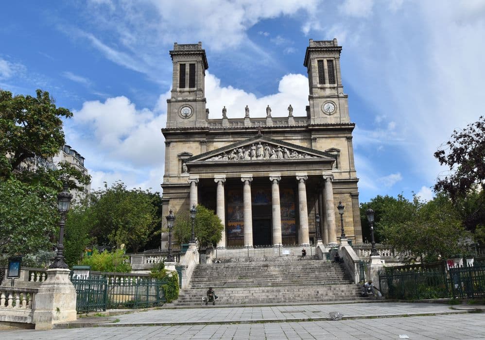 La construction de l'édifice est lancée en 1824 sur les plans de l'architecte Jean-Baptiste Lepère, rejoint peu après par son gendre Jacques-Ignace Hittorff qui modifie quelque peu le projet. Les travaux sont interrompus par les évènements politiques de 1830 et l'église est finalement livrée au culte en 1844. Le décor n'étant pas achevé, les commandes se succèdent jusqu'en 1854. L'église se distingue par son élévation à deux étages de colonnades et par la grande frise peinte à la cire d'Hippolyte Flandrin. Hittorff tire ses références architecturales de l'Antiquité, d'où sa préférence pour l'ordre ionique et l'utilisation de la sculpture en ronde-bosse pour le fronton. Jalon important dans l'architecture religieuse du 19e siècle, cette église fut conçue par Hittorff comme un véritable musée des techniques décoratives disponibles en son temps : peinture à la cire, vitraux peints en verres émaillés, fonte peinte ou dorée, etc.