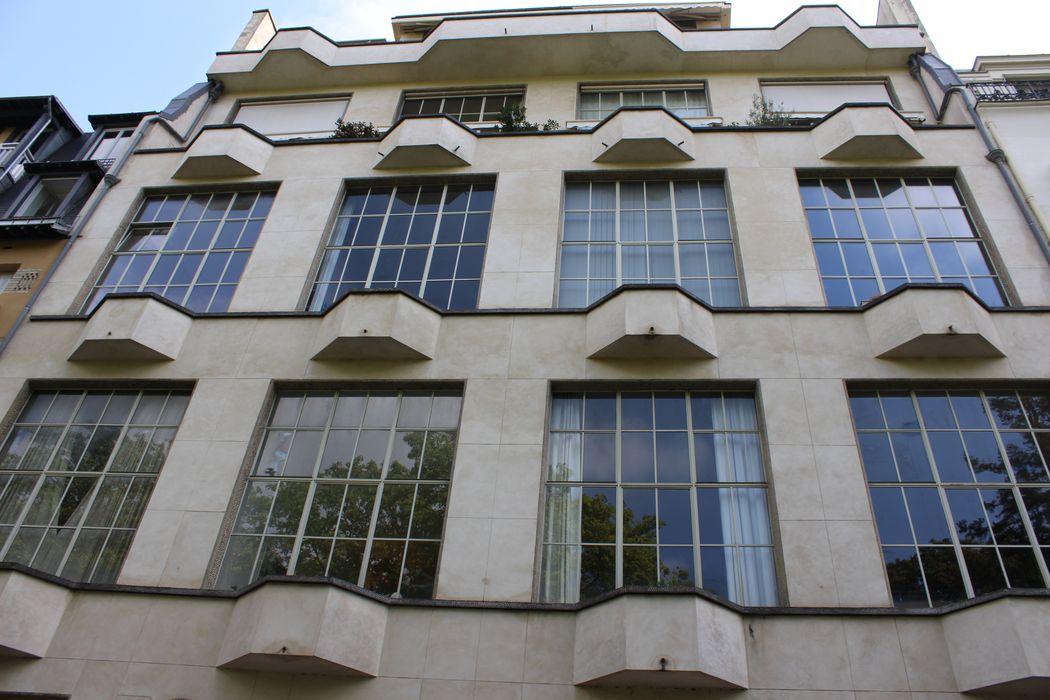 Immeuble de logements et d'ateliers d'artistes construit en 1930 par l'architecte Michel Roux-Spitz. Situé aux abords du parc Montsouris, cet édifice, réalisé en béton armé, appartient à ce que l'architecte a appelé sa "série blanche", dont l'immeuble de la rue Guynemer (voir notice PA00088587) est le prototype. Il reprend les motifs architecturaux de bow-windows et de petits oeils-de-boeuf au rez-de-chaussée. La façade de ce niveau est ornée de mosaïques que l'on retrouve dans les bordures autour des baies.