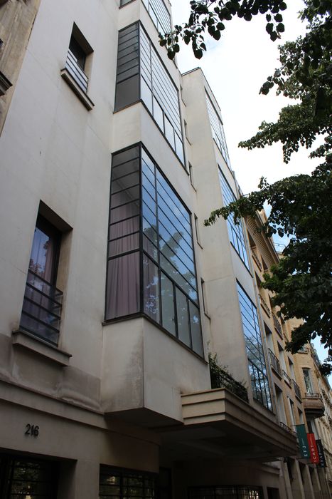 Immeuble comportant des ateliers d'artistes et des appartements, ainsi qu'un petit cinéma au rez-de-chaussée, construit en 1932 par Bruno Elkouken, architecte d'origine polonaise, arrivé à Paris en 1920 et parti aux Etats-Unis en 1937. Les ateliers sont éclairés par les grandes verrières de deux bow-windows rectangulaires, s'étirant sur six étages et caractérisées par le graphisme géométrique de leurs menuiseries. Le cinéma, inauguré en septembre 1934, possède une salle d'une capacité de 278 places. Sous les noms de "Raspail 216" et "Studio Raspail", il a accueilli le public jusqu'en 1982.