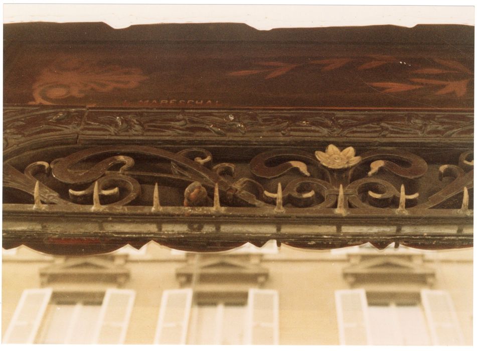 Boucherie installée vers 1913 par la maison Jules Mareschal (signature) , spécialisée dans l'agencement de boucheries. La devanture autrefois ouverte sur la rue est encadrée de montants en fonte, ornés d'iris ; le soubassement est en marbre ; les trois panneaux à caissons sont peints et dorés sous verre et présentent des griffons à leur base.