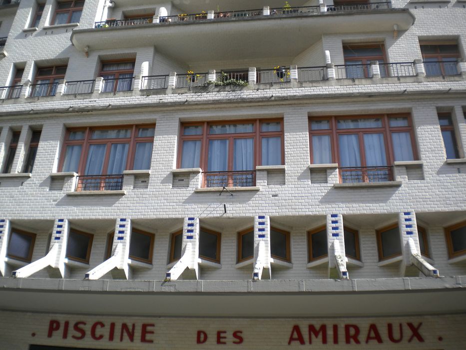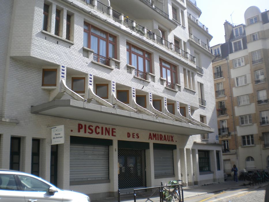 Ensemble de logements sociaux construit par l'architecte Henri Sauvage de 1922 à 1927, suivant une commande de la Société des Habitations à Bon Marché de la Ville de Paris. Chaque logement possède une terrasse, grâce à la disposition en gradins. Ce système avait été conçu en 1909 par l'architecte qui l'a d'abord mis en oeuvre en 1912 pour son immeuble de la rue Vavin (voir notice PA00088645). Comme celui-ci, l'immeuble de la rue des Amiraux est entièrement revêtu de carreaux de faïence blanche type "métro", fournis par les établissements Boulenger à Choisy-le-Roi (94). L'immeuble de sept étages, construit en béton armé, s'organise autour d'une étroite cour centrale où est située une piscine, inaugurée en 1930 ; elle est entourée de deux niveaux de cabines et couverte par un lanterneau. Cette piscine, aujourd'hui municipale, a été réhabilitée en 1982 par les architectes Daniel et Patrick Rubin (agence Canal).