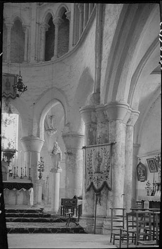Témoignages de maçonneries préromanes sous le choeur. Dispositions actuelles du 12e siècle, modifiées au 13e siècle (reconstruction du choeur en élévation et des couvrements de la nef) et fin 15e-début 16e siècle (réfection des charpentes et de la nef, ainsi que celle du choeur et les voûtes de la nef et de ses bas-côtés). Le choeur a porté un ensemble de lambris en bois aujourd'hui disparu. Enduits et décors peints en partie perdus.