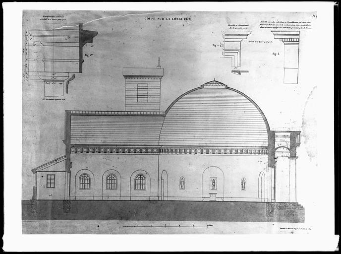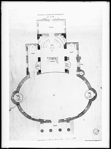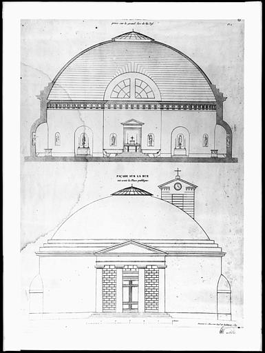 L'église a été construite pendant la Révolution (première pierre posée en 1790) par Louis Le Masson, architecte et ingénieur des Ponts et Chaussées, élève de Claude-Nicolas Ledoux. Elle possède un plan elliptique surmonté d'un dôme. En 1868, une campagne d'agrandissement ouvre un des deux grands côtés de l'église pour faire face à l'augmentation de la population ; cet agrandissement modifie l'orientation de l'église et entraîne la construction du portique d'entrée (péristyle formé de quatre colonnes ioniques surmonté d'un entablement et d'un fronton triangulaire).