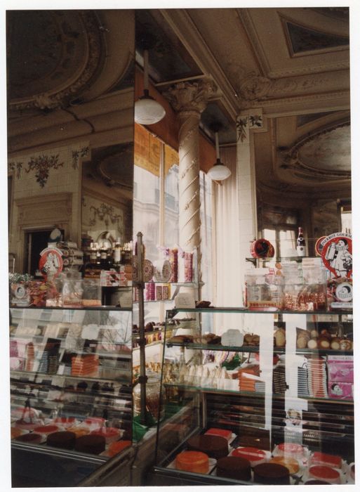 Boulangerie installée vers 1900 par la maison Chevenot, de Montrouge (92) ; miroirs et carreaux de faïence, avec un plafond peint d'un ciel sur lequel se détache une hirondelle et un papillon.