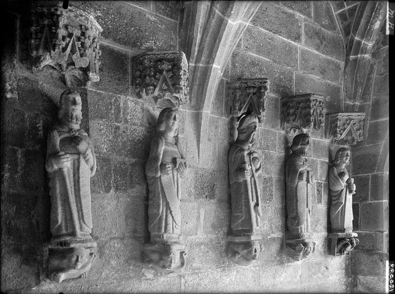 L'église, construite au 15e et 16e siècle, conserve un porche latéral voûté intéressant, orné des statues des apôtres. Au-dessus se trouve une salle qui dut servir de trésorerie. La façade ouest s'agrémente d'un campanile à trois cloches. Le socle du calvaire porte la date de 1758, année qui vit certainement le remaniement de la base, le fût et la partie supérieure de l'ouvrage semblant plus anciens.