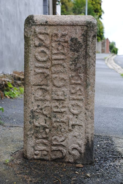 Ouvrages en granit de l'époque du duc d'Aiguillon, ces bornes, disposées au départ des grandes routes, rappellent l'ancienne corvée due pour l'entretien des chemins royaux. De forme rectangulaire, aux angles biseautés, elles portent sur deux faces des inscriptions indiquant la part de l'entretien à la charge de la ville mentionnée. La borne ici concernée porte la mention : "Tâche de Servel ; 1097 toises".