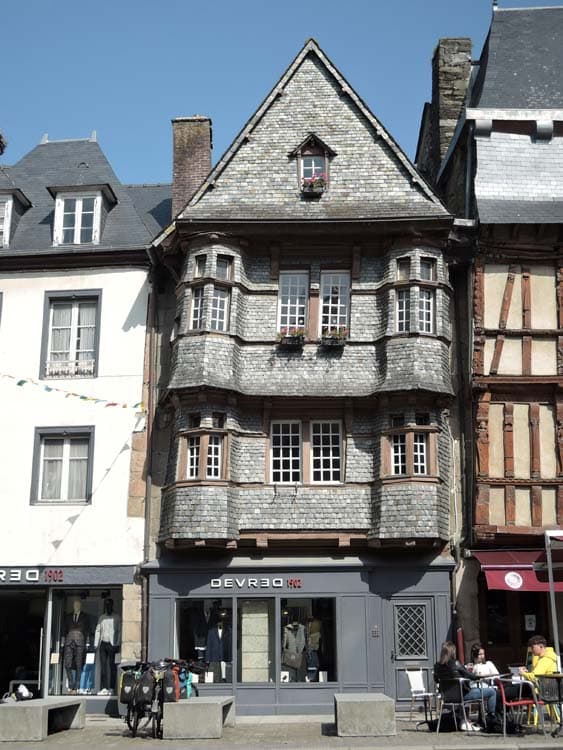 Façade présentant deux bretèches polygonales à deux étages, placées symétriquement de chaque côté de la fenêtre centrale. Il s'agit d'une disposition originale, rarement adoptée. La construction est à pan de bois, entièrement revêtu d'ardoises. La partie inférieure de chaque étage forme auvent de protection sur l'étage inférieur.