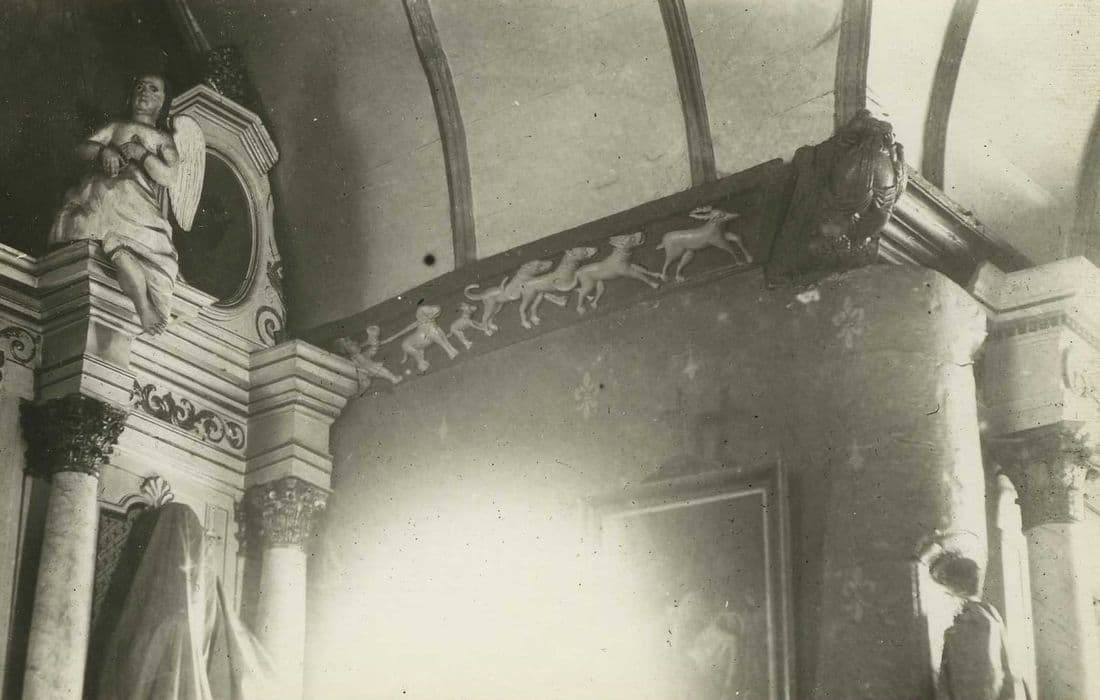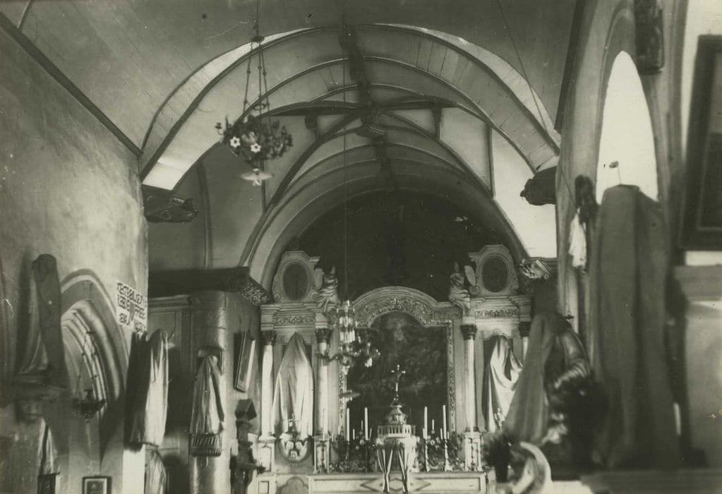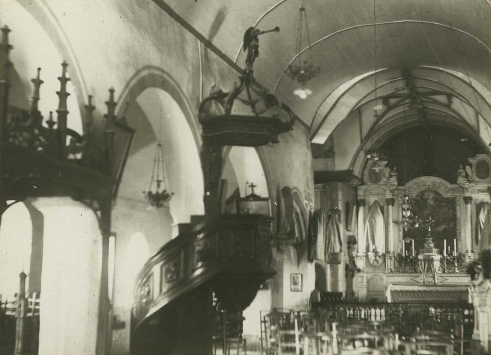 L'intérieur de l'église conserve une inscription mentionnant la reconstruction de l'édifice en 1580. Le clocher date de 1749. L'édifice actuel, en forme de croix, comprend une nef avec bas-côtés de six travées et clocher-mur, un transept et un choeur. Les sablières du choeur sont décorées de petits personnages et d'animaux.
