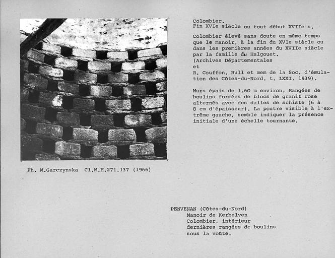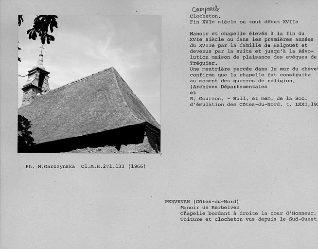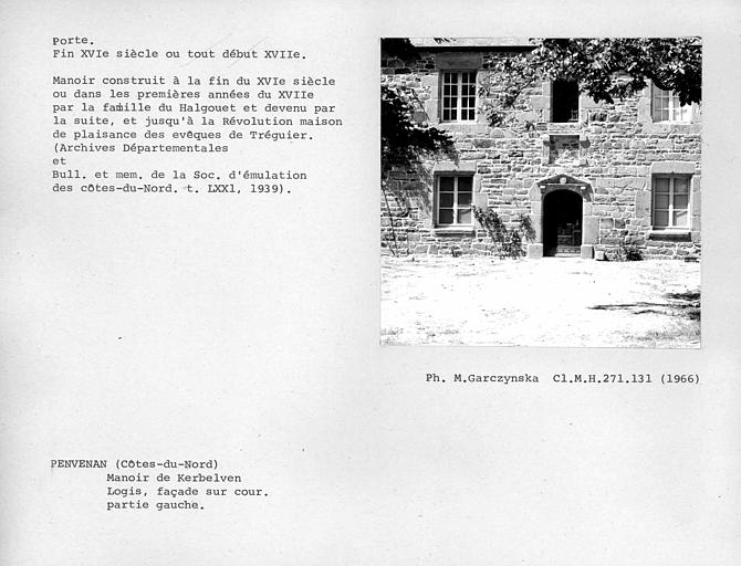 Mise à part l'extrémité Est du manoir remaniée au 19e siècle, l'ensemble des bâtiments remonte au 14e (tour et salle des gardes) , 15e (manoir) , 16e (chapelle) et 17e siècle (colombier). L'ensemble est construit en granit caractéristique de la région. En 1700, le domaine est acheté comme résidence d'été par l'évêque et le comte de Tréguier. Les fermiers avaient pour mission de tenir en état toute l'année le manoir et le jardin potager. A la Révolution, le domaine est vendu comme bien national à un papetier de Tonquédec. Vers 1860, il fut transformé en ferme. A l'intérieur, cheminées, boiseries, parquet Versailles.