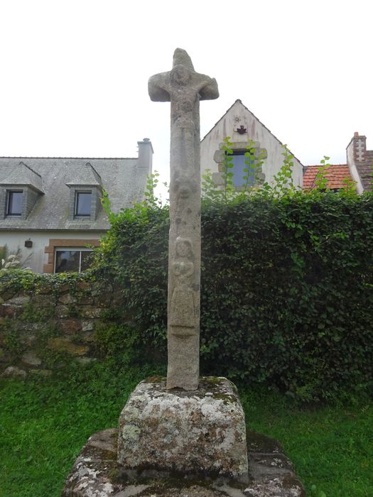 Le calvaire est placé sur un soubassement constitué de deux massifs octogonaux en pierre de taille formant marche. Sur ce soubassement est placé un cube dont les arêtes sont chanfreinées. Une inscription illisible est gravée dans le bloc. La pierre monolithe qui forme le calvaire présente un fût et des arêtes chanfreinées. Une Bretonne vêtue de son costume et de sa coiffe, les deux mains repliées sur la poitrine, est sculptée à la base. Au-dessus, le Christ squelettique, une draperie autour des hanches, est crucifié, les pieds reposant sur une tête de chien.