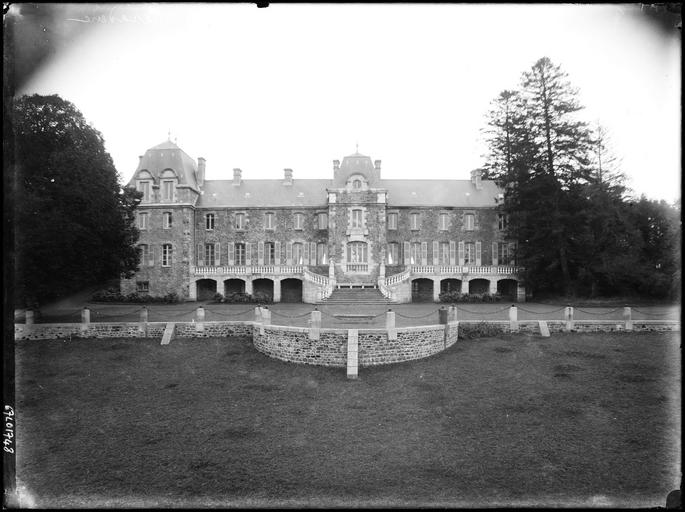 Château construit en 1680 par M. de Caradeuc et fut habité par le procureur général La Chalotais qui fit expulser les Jésuites de Bretagne. Bâtiment rectangulaire se composant d'un corps de logis avec un pavillon central et un latéral à l'est. Le château a été remanié en 1820 par la création d'un fronton triangulaire sur la face sud du pavillon central, portant les blasons Caradeuc et Martel ainsi que la devise "Arreste ton coeur". Vers le milieu du 19e siècle, le château a été séparé des communs. A la fin du 19e siècle, surélévation des toitures du pavillon et construction d'un escalier monumental au nord. Sur la façade nord, le rythme du pavillon central et des pavillons latéraux est accentué par une saillie de ceux-ci. Le corps de logis est symétrique et se distingue un vaste escalier à trois révolutions. Le jardin à la française est limité par les douves.££En 1898, l'architecte Mellet donna à l'édifice la physionomie qu'il présente à ce jour, et le paysagiste André l'entoura d'un vaste parc avec jardins à la française, terrasses, allées et ronds-points ornés de fabriques, et massif forestier. Ce parc est un des plus vastes de Bretagne, unissant formalisme et souplesse. Très peu remaniée par la suite, cette oeuvre paysagère retient l'intérêt par la qualité du mobilier et de la statuaire (portiques de style Renaissance, sculptures des 17ème et 19ème siècles, colonnes des halles de Combourg, statue de Louis XVI).