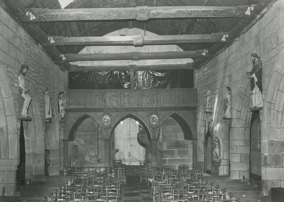Cette église date, majoritairement, de la fin du 15e et du début du 16e siècle. Les fenestrages du 14e siècle ont été réemployés dans la chapelle du midi. Au 17e siècle, construction du clocher, daté de 1681 à 1687, ainsi que du choeur. Il s'agit d'un édifice à plan cruciforme, avec appendices constitués par le porche sur la face sud et la sacristie. Le chevet est à pans coupés. Appareil de granit irrégulier. La porte d'entrée, en plein cintre, est ornée à son sommet d'un fronton triangulaire soutenu de chaque côté par des colonnes cylindriques en demi-relief. Le sommet du fronton est coupé par une niche à coquille qui repose sur la base du fronton et dans laquelle se trouve une statue. La tour carrée du clocher est ornée à son sommet d'un balcon modilloné et ajouré de petites arcades. A la hauteur de ce balcon se trouve la chambre des cloches, constituée de deux arcades ouvertes. Au sommet de la chambre des cloches se trouve un autre balcon, à balustres duquel part la flèche de pierre à crochets. Le long de la tour, de la base au premier balcon, est accolée une tourelle ronde permettant l'accès au clocher. Ce clocher s'est effondré en 1978. Le porche d'entrée présente un arc légèrement brisé, mouluré, dont la moulure supérieure est ornée de motifs sculptés. De chaque côté sont placées des colonettes surmontées de pinacles. Les rampants du pignon sont ornés de motifs sculptés. La base de chaque rampant s'agrémente de gargouilles. L'intérieur du porche renferme des fresques représentant un cortège funèbre. A l'intérieur, les lambris de la voûte sont peints et les sablières sculptées.