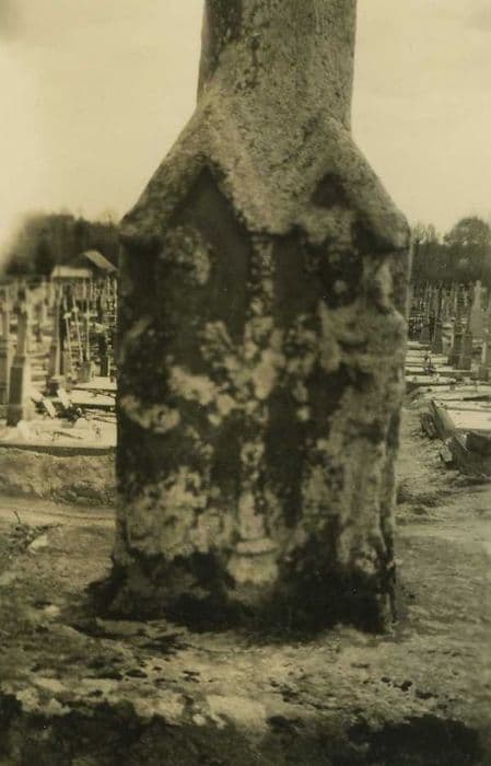 La base se compose de personnages isolés, sous une forme triangulaire, autour d'un fût octogonal. Le motif est présenté comme bas-relief à deux rampants, sur forme trilobée. L'ensemble se trouve dans le fond du cimetière.