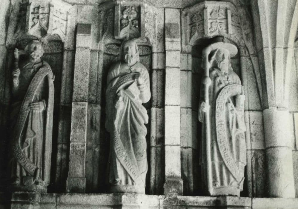 Beau porche avec une série d'apôtres en granit.
