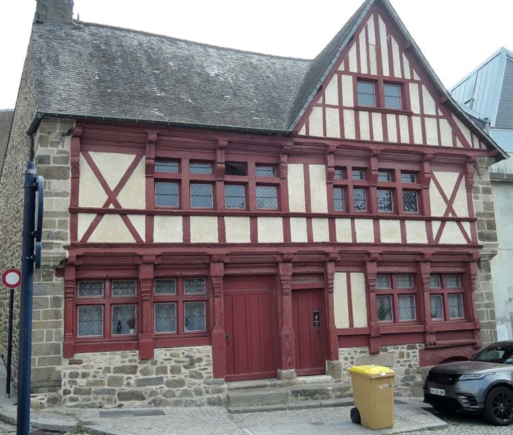 L'étal du rez-de-chaussée a été remplacé par une porte de garage. Le premier étage en pans de bois possède une partie d'allège à cinq potelets moulurés, puis trois fenêtres entre quatre poteaux également moulurés soutenant les corbeaux sous la toiture. Les fenêtres ont été remaniées.