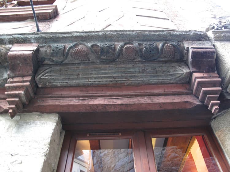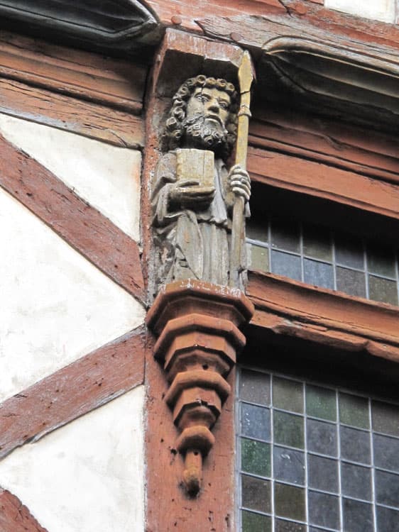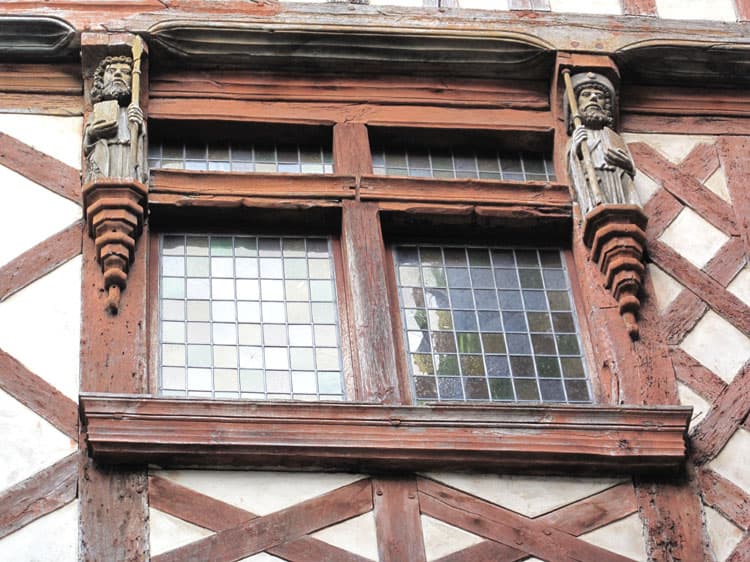 La façade de cette maison a conservé sans trop de modification sa disposition ancienne, même au rez-de-chaussée, ce qui est assez rare. Sa construction est entièrement en pan de bois, et les principaux éléments de structure sont apparents. Sablières, montants de fenêtres et consoles sont moulurés et sculptés.