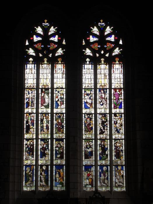 Le chevet conserve une fenêtre jumelée avec vitraux du 16e siècle.