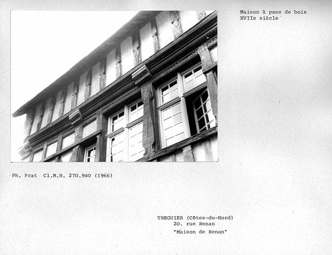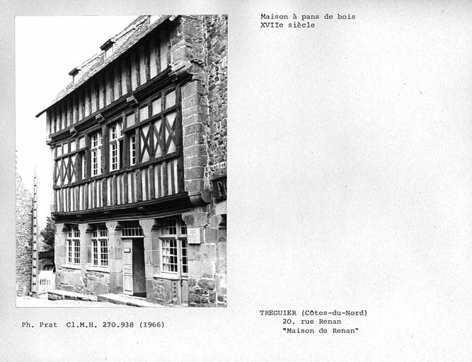 Maison dans laquelle naquit Ernet Renan en février 1823, qui y vécut jusqu'à ses quinze ans. Le rez-de-chaussée est construit en granit, et les étages en pans de bois. L'édifice appartient au 17e siècle et présente les caractéristiques de construction de cette époque en Bretagne.
