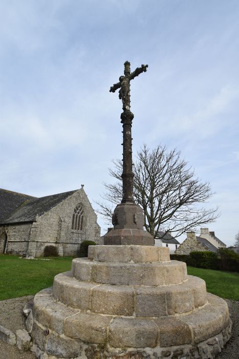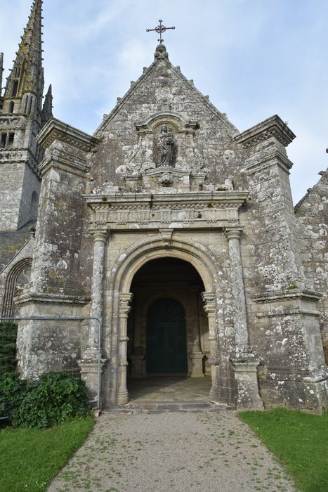 L'église fait partie d'un groupe d'édifices bâtis au 17e siècle, en Bretagne, dans le style de la fin de la période gothique. Construite en granit, l'église se compose d'une nef avec bas-côtés, d'un transept, d'une abside polygonale et d'une chapelle au sud. Trois dates gravées à différents endroits du bâtiment permettent d'en établir les diverses époques de construction (1648 dans le bras nord du transept ; 1655 à l'entrée du choeur ; 1680 au-dessus de la porte de la sacristie). Sur la façade occidentale s'élève un clocher carré surmonté d'une flèche en granit dont le rez-de-chaussée constituait l'ancien porche d'entrée. Le portail principal se situe maintenant au sud, en avant d'un porche de style plutôt classique. L'église a été partiellement détruite par un incendie en 1936.