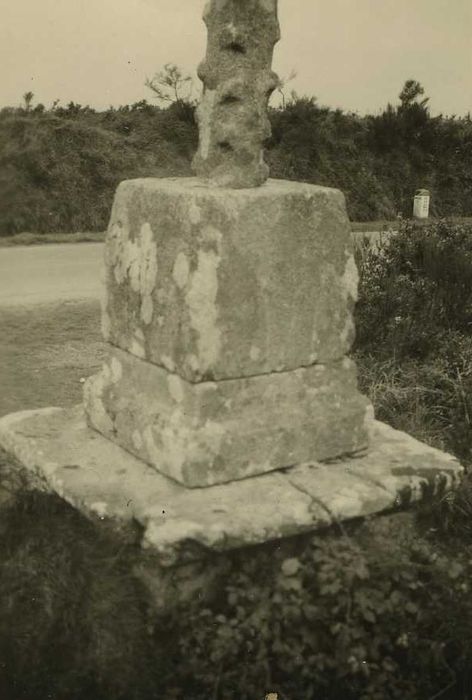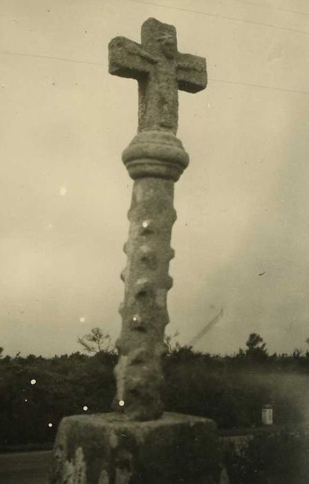 Une chapelle, aujourd'hui complètement ruinée, s'élevait à cinq cent mètres de la croix. Le soubassement carré est constitué par de grosses pierres de taille et orné d'une corniche. Au centre du soubassement, et entre celui-ci et le socle proprement dit, a été interposé un piedestal mouluré en cavet renversé. Le socle carré, de granit monolithe, présente quatre pans abattus pour déterminer un tronc de pyramide. Le fût est garni de bubons de peste qui témoignent du caractère votif de l'ouvrage. La croix est reliée au fût par un manchon de granit circulaire et mouluré. A l'est est représenté le Christ ; à l'ouest la Vierge mère. L'inscription sur le socle mentionne la date de 1312.
